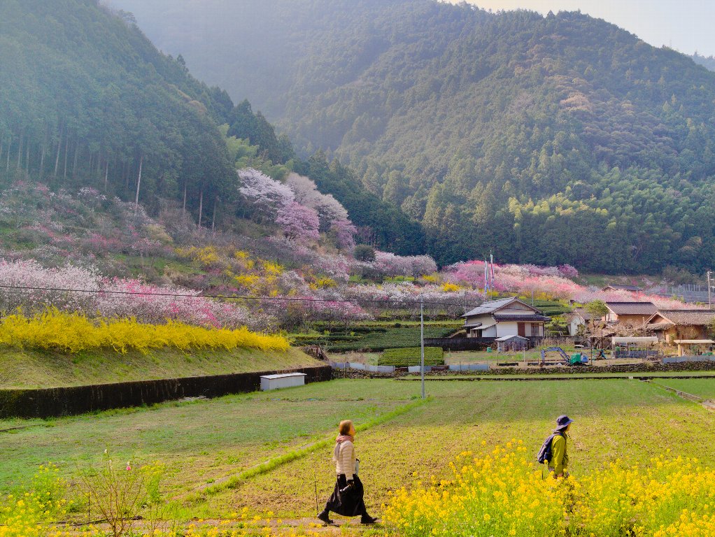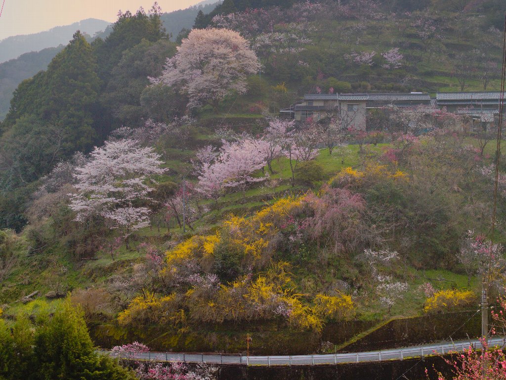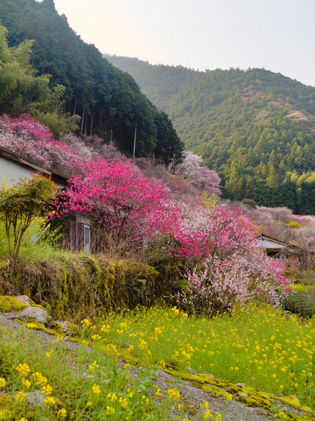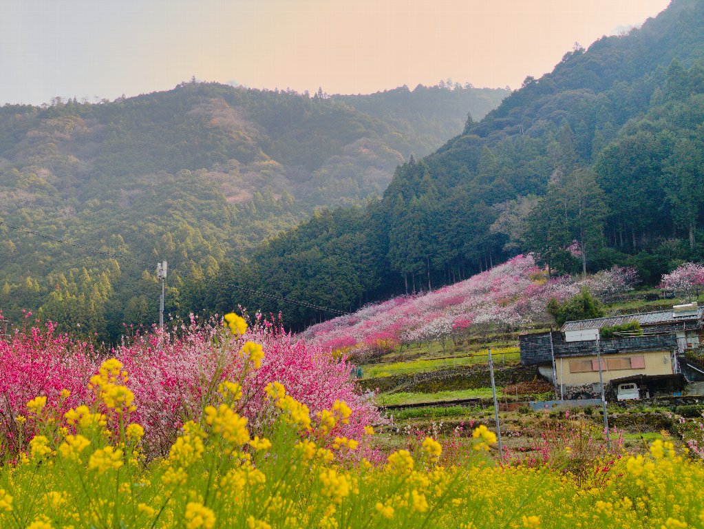 青空、山々の深い緑、三色の花桃、そしてレンギョウや菜の花の黄色が見事に調和しています。この風景こそが「桃源郷」と呼ばれる所以なのでしょう。