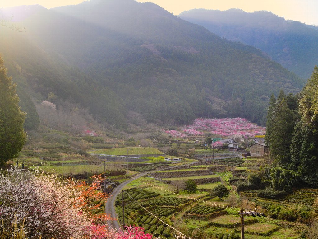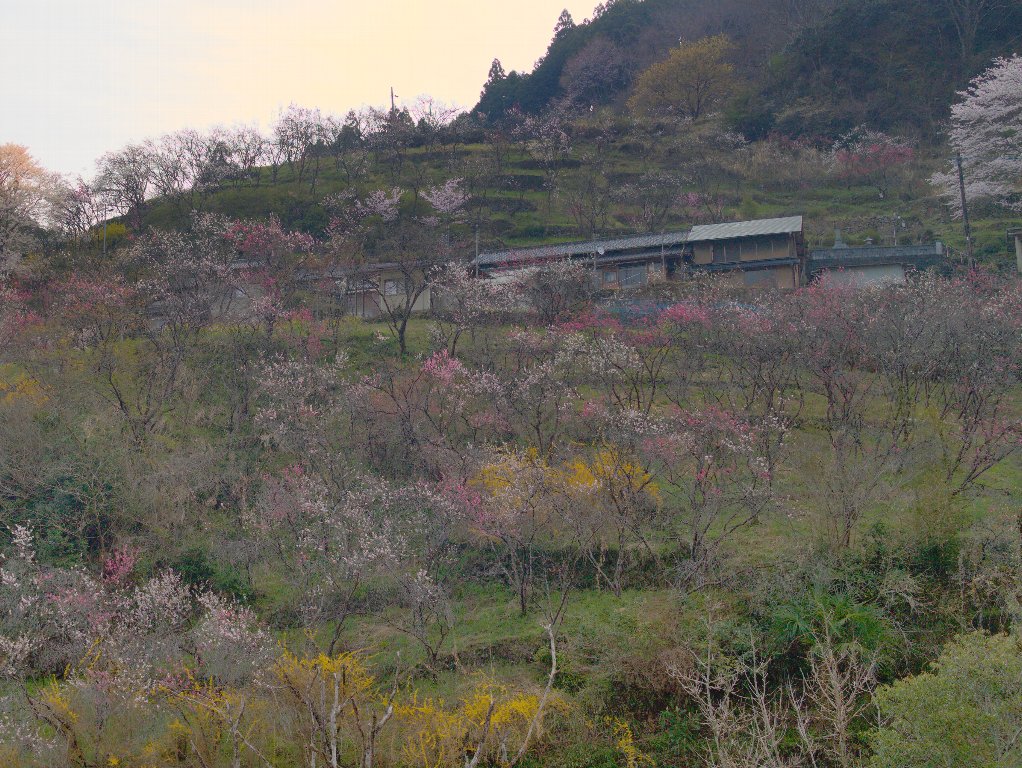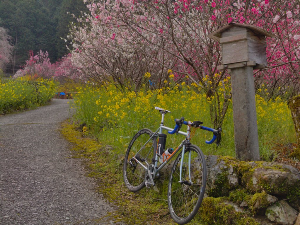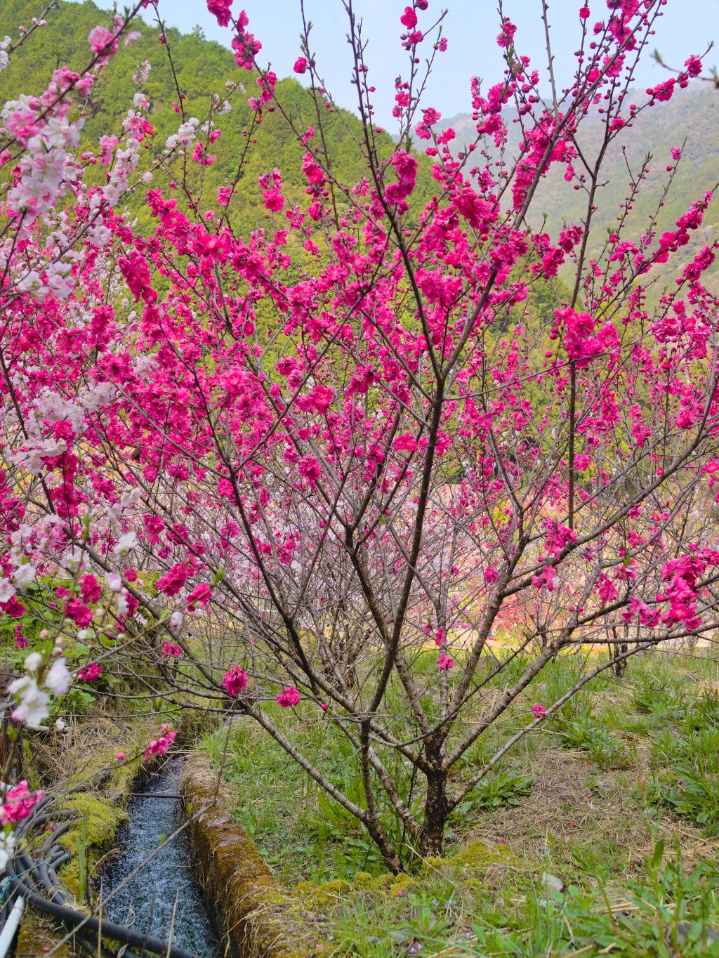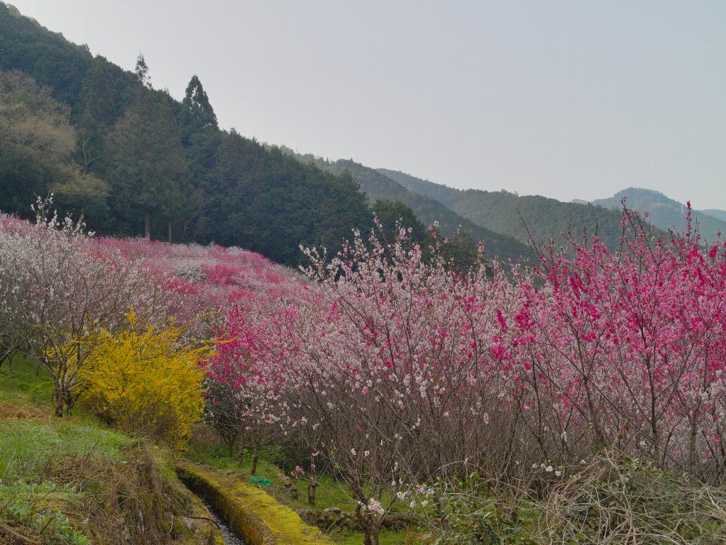 青空、山々の深い緑、三色の花桃、そしてレンギョウや菜の花の黄色が見事に調和しています。この風景こそが「桃源郷」と呼ばれる所以なのでしょう。