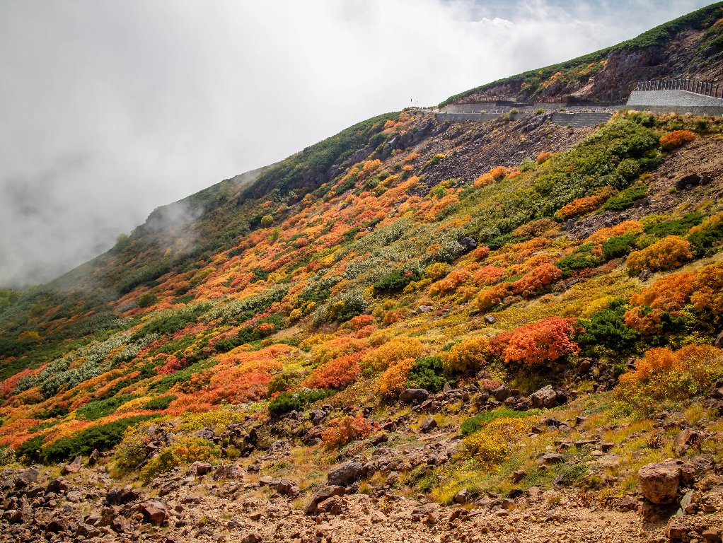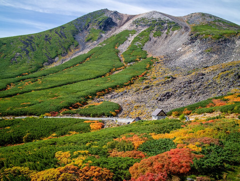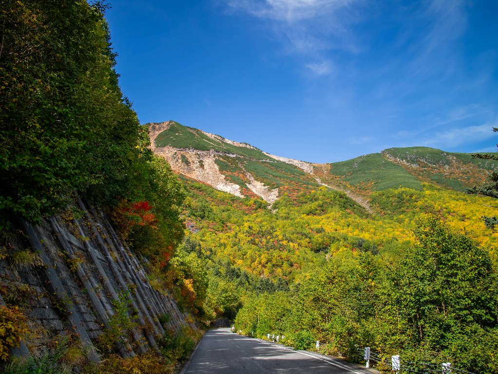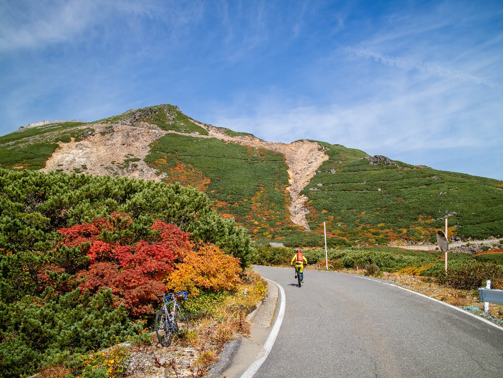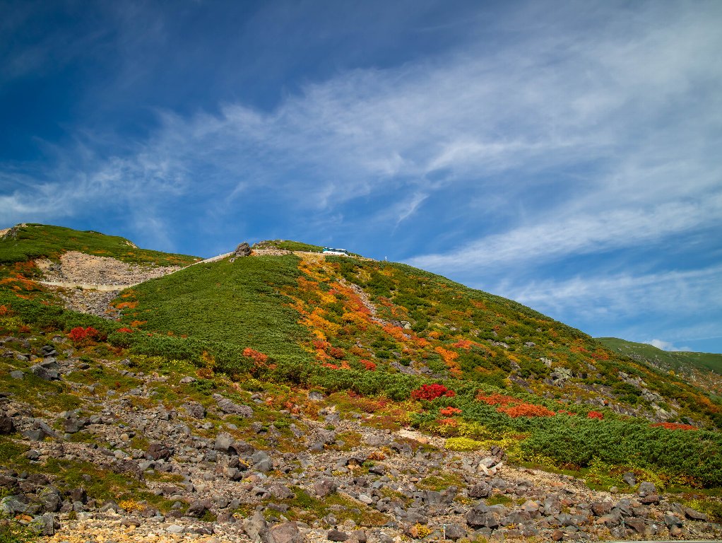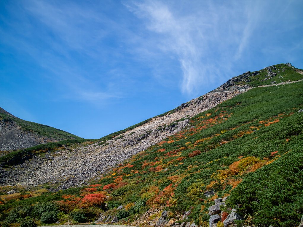 標高2350mの位ヶ原山荘あたりで森林限界を超えると、視界が一気に開けます。眼下に広がるはずの松本市内の大パノラマは薄い雲に覆われて見えませんでしたが、目指す乗鞍岳ははっきりと見えました。ここから先は、青い空と乗鞍岳の紅葉でテンションが上がります。この区間こそ、まさに乗鞍の真骨頂。「ここは本当に日本?」と思うほどダイナミックな風景が広がります。