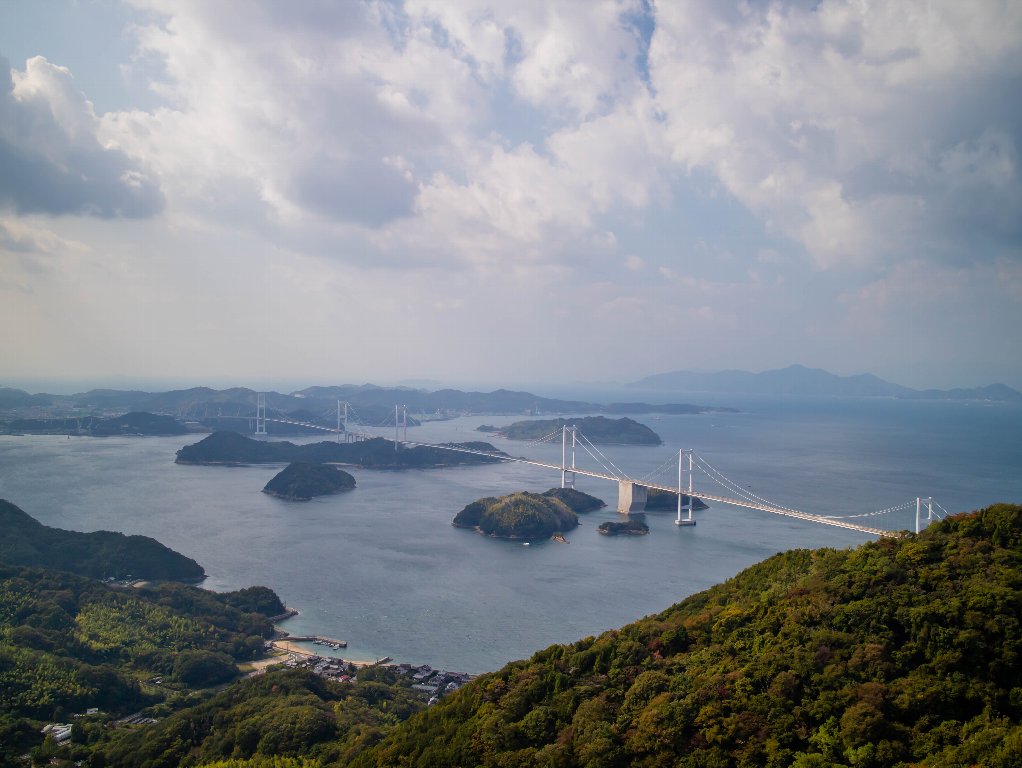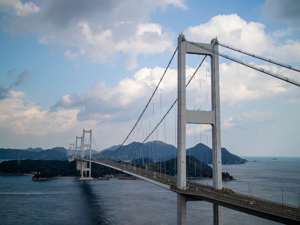 そして展望台に到着。展望台からは雄大な来島海峡大橋の全景。観光パンフレットで見慣れた景色ですが、やはり“生”で見ると格別です。
