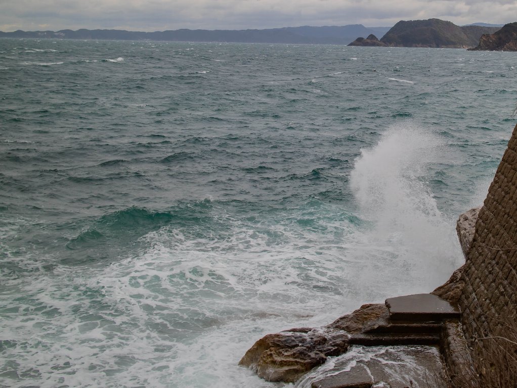 途中の産湯海水浴場では、この強風がサーファーにとっては最高のコンディションだったようです。この寒い季節にもかかわらず、大勢のサーファーが波に乗り、海は賑わいを見せていました。この寒さの中信じられません。。。驚