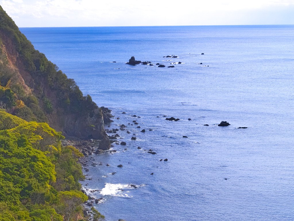 R55を数キロ走り、r289へ分岐。この道を走るのは確か2度目ですが、車が全く通らない快適な道です。名もなき峠を越えて少し下った場所は、このコース一番の撮影ポイント。日和佐道路の向こうに木岐の町、そしてその奥に太平洋を望む絶景が広がります。