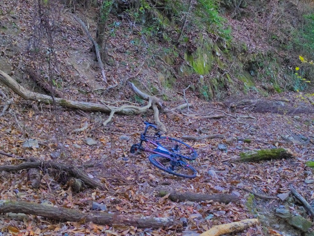 動物愛護センター付近まではきれいなアスファルトでしたが、やがてコンクリート舗装へ。長谷の集落を過ぎ、“諸車通行禁止”の看板を越えると、路面はいよいよ砂利と落葉のグラベルへと表情を変えていきます。「さぁ、ここからがグラベル本領発揮!」と意気込んだのも束の間、あっけなく峠(曲突越え)に到着しました。
