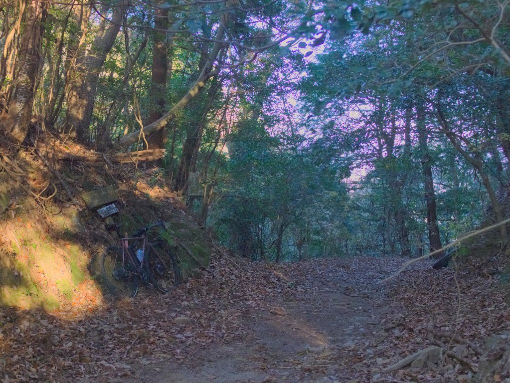 動物愛護センター付近まではきれいなアスファルトでしたが、やがてコンクリート舗装へ。長谷の集落を過ぎ、“諸車通行禁止”の看板を越えると、路面はいよいよ砂利と落葉のグラベルへと表情を変えていきます。「さぁ、ここからがグラベル本領発揮!」と意気込んだのも束の間、あっけなく峠(曲突越え)に到着しました。