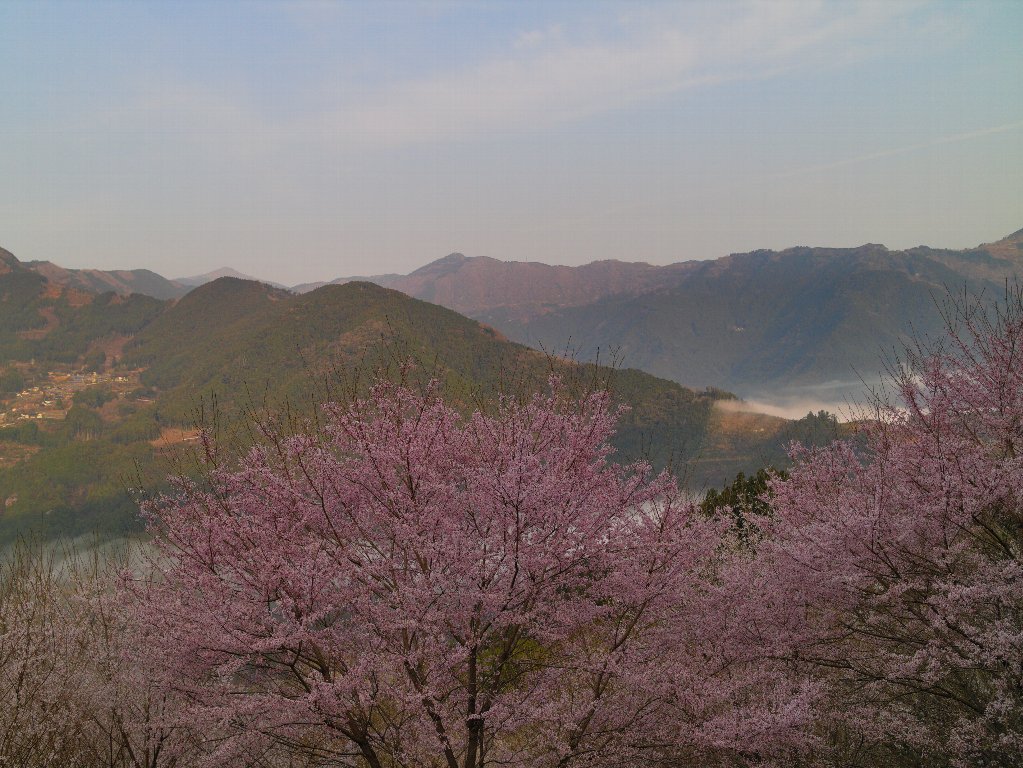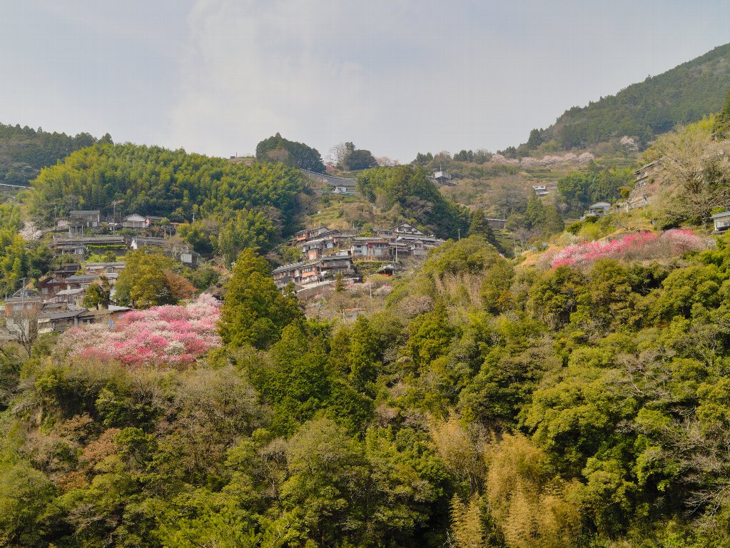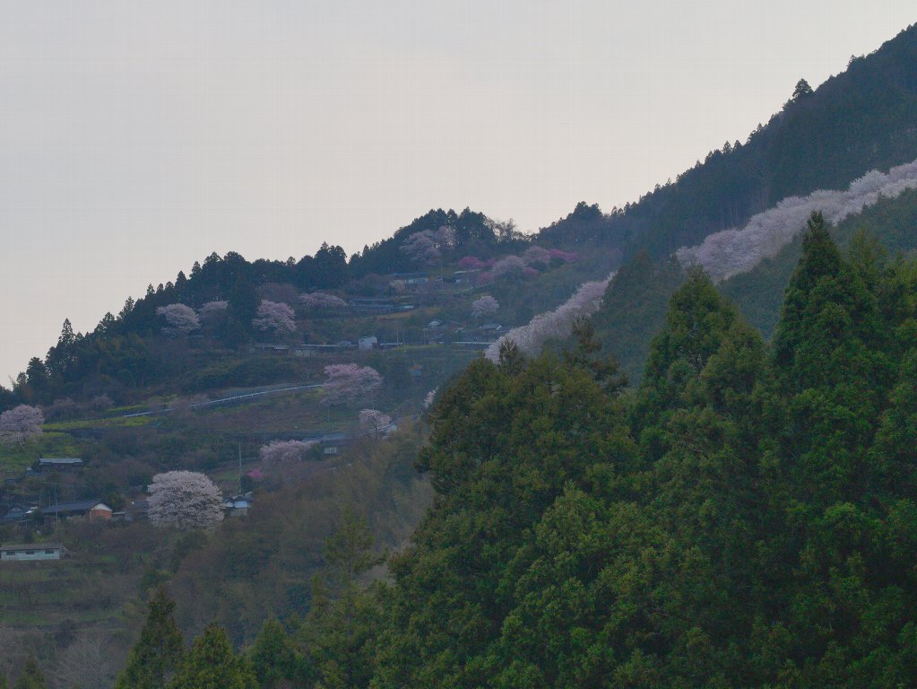 途中も桜を眺めながら下り、R439からR33へ。「ひょうたん桜」をぐるりと一周する形で仁淀町役場まで戻ります。次に向かったのは、標高約250mに位置する「上久喜地区の花桃」、そしてその手前にある「久喜地区の花桃」。桜の次は花桃です。