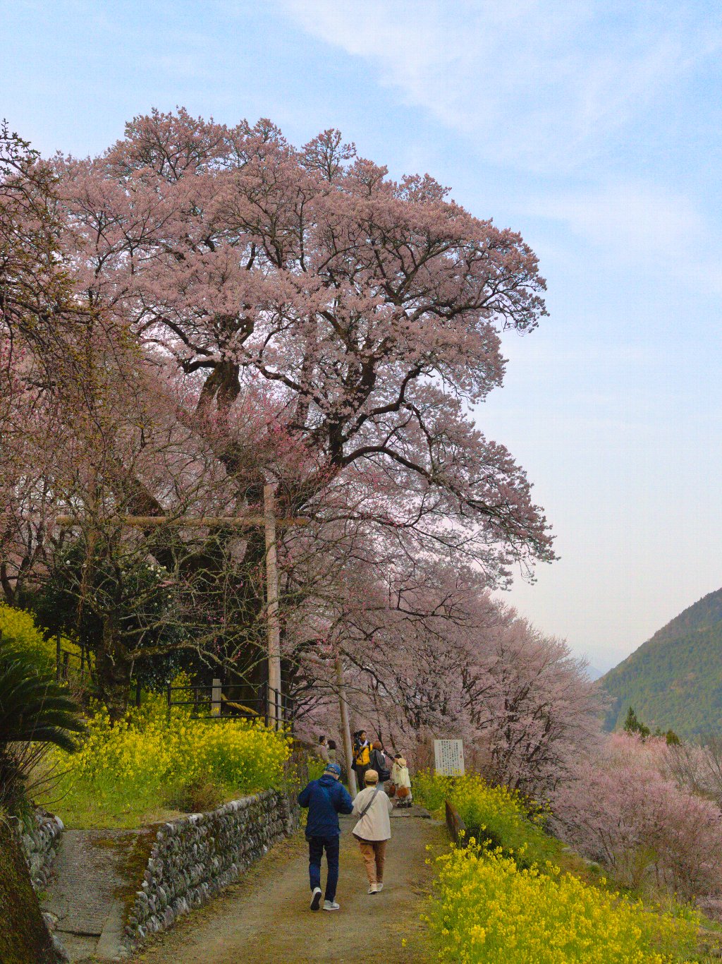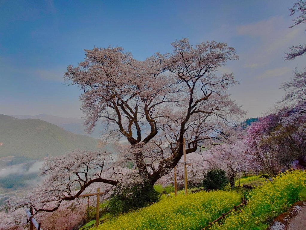 桜の足元に広がる菜の花の黄色とのコントラストも見事。青空に映える淡い花びらが、登坂の疲れを一瞬で吹き飛ばしてくれます。周辺をウロウロとお花見。楽しい時間です。