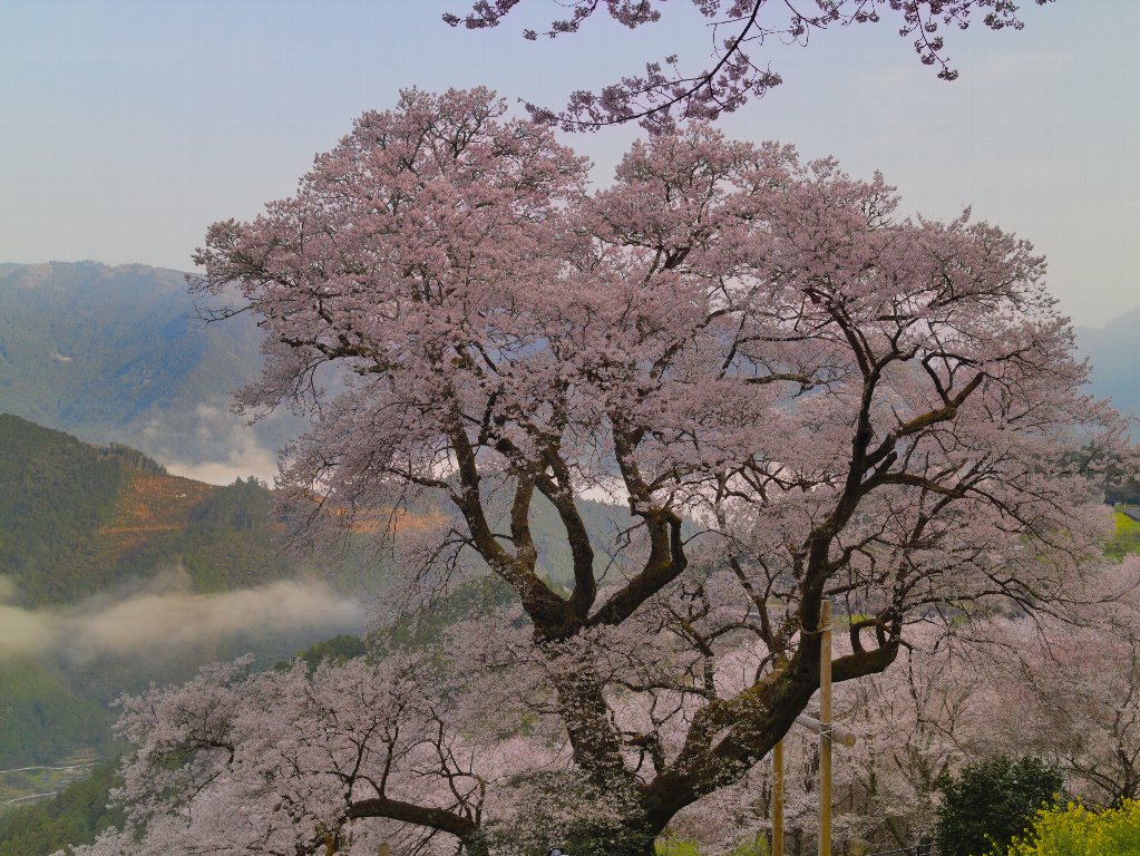 高知県の天然記念物にも指定されている「ひょうたん桜」。樹齢は約500年、樹高21mを誇る巨木で、周囲の茶畑や山々を見守るように堂々と立っています。空いているかな?と期待したのですが、既に100人くらいはいました。皆さん何時から登っているのでしょう・・・。