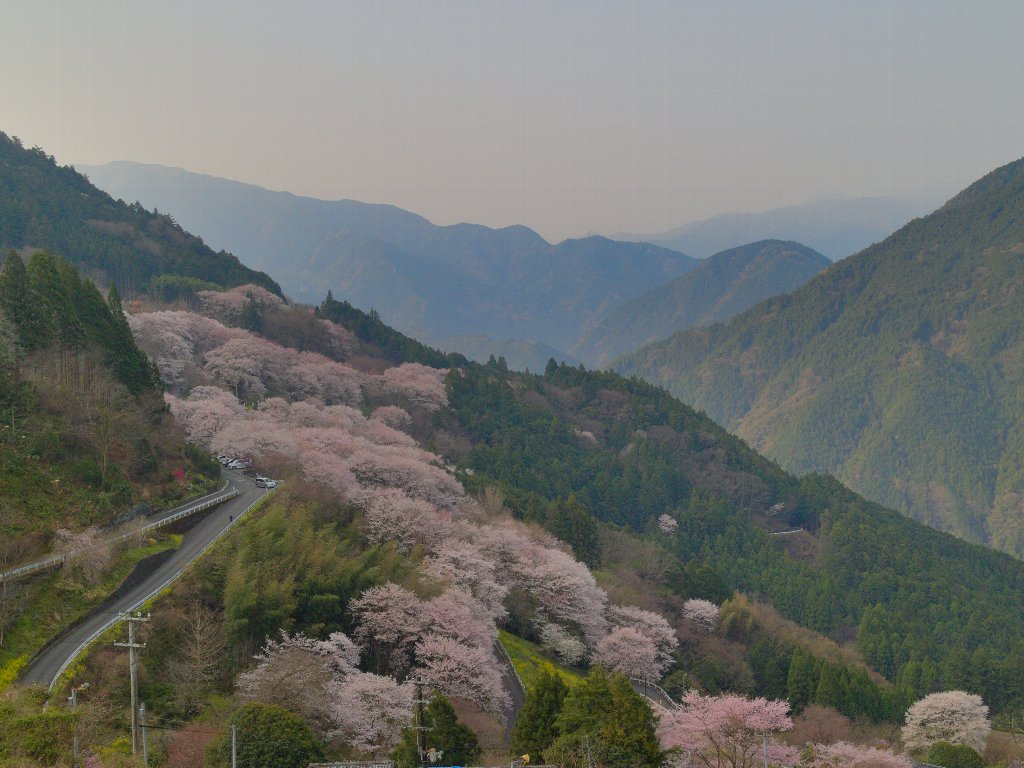 途中も桜を眺めながら下り、R439からR33へ。「ひょうたん桜」をぐるりと一周する形で仁淀町役場まで戻ります。次に向かったのは、標高約250mに位置する「上久喜地区の花桃」、そしてその手前にある「久喜地区の花桃」。桜の次は花桃です。