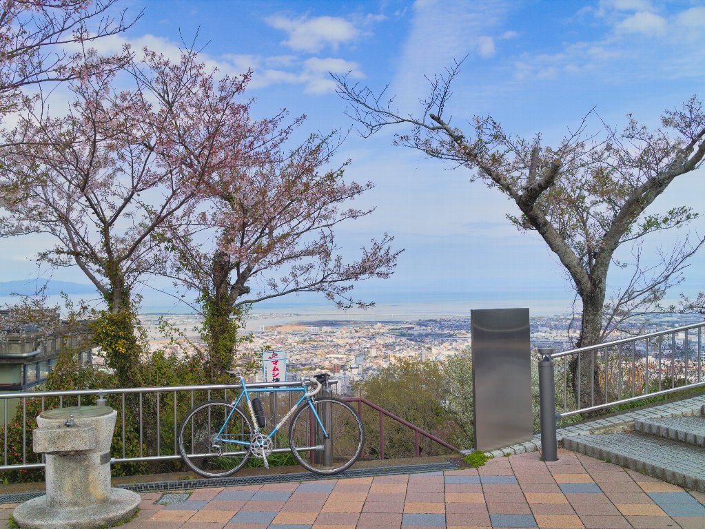 そして最後は庄町側から眉山越え。西部公園までは車両規制がかかっているものの、自転車は問題なく通行可能。山頂の展望広場には、桜を楽しむ多くの人々が集まり、それぞれに春のひとときを満喫している様子でした。