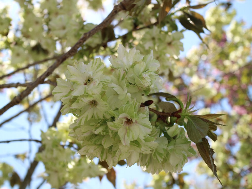 そしてここには、もうひとつのお楽しみがあります。淡い緑色をした珍しい桜「御衣黄桜」です。八重桜の一種で、先日やまさんが写真をアップしていた「鬱金桜」とよく似ていますが、微妙に色合いや花びらの形が異なるそうです。正直その違いははっきりとは分かりませんが、ここの桜は皆さん「御衣黄桜」と言ってますのでそうなんでしょうね。