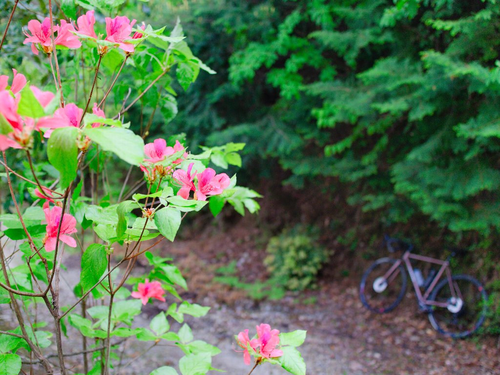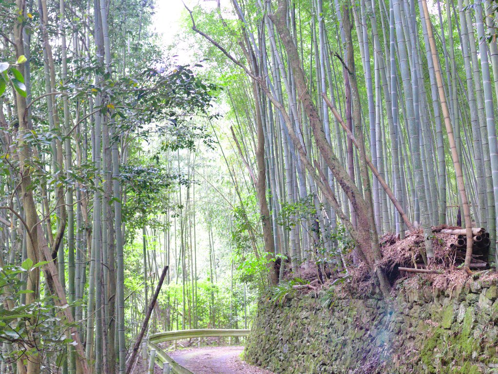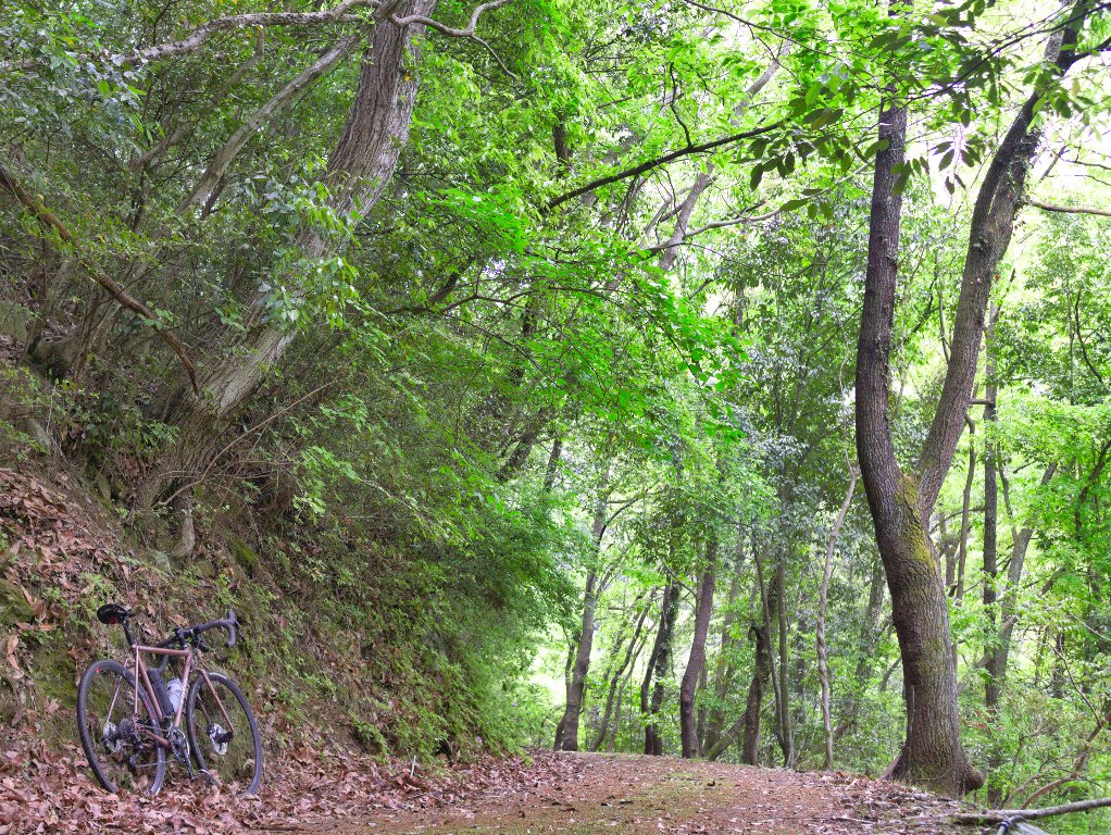 道は、予想通りの荒れ具合。舗装は割れ、苔や落石も点在するワイルドなコンディションですが、こういう道もまた楽しいもの。展望は少ないものの、静かな雰囲気の中で新緑を全身で感じながら進みます。